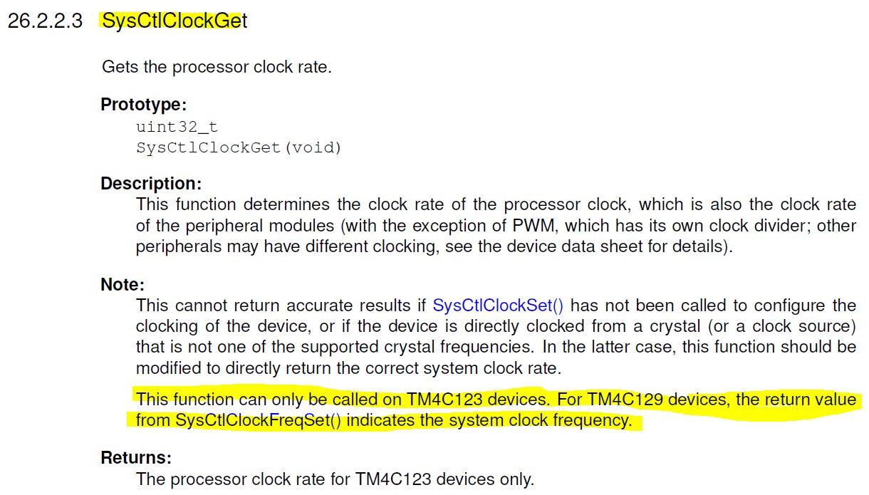 void ConfigureDevice(void) { #ifdef CRYSTAL_FREQ // // Since the crystal frequency was specified, enable the main oscillator // and clock the processor from it. // #if defined(TARGET_IS_TM4C129_RA0) || \ defined(TARGET_IS_TM4C129_RA1) || \ defined(TARGET_IS_TM4C129_RA2) // // Since the crystal frequency was specified, enable the main oscillator // and clock the processor from it. Check for whether the Oscillator range // has to be set and wait states need to be updated // if(CRYSTAL_FREQ >= 10000000) { HWREG(SYSCTL_MOSCCTL) |= (SYSCTL_MOSCCTL_OSCRNG); HWREG(SYSCTL_MOSCCTL) &= ~(SYSCTL_MOSCCTL_PWRDN | SYSCTL_MOSCCTL_NOXTAL); } else { HWREG(SYSCTL_MOSCCTL) &= ~(SYSCTL_MOSCCTL_PWRDN | SYSCTL_MOSCCTL_NOXTAL); } // // Wait for the Oscillator to Stabilize // Delay(524288); if(CRYSTAL_FREQ > 16000000) { HWREG(SYSCTL_MEMTIM0) = (SYSCTL_MEMTIM0_FBCHT_1_5 | (1 << SYSCTL_MEMTIM0_FWS_S) | SYSCTL_MEMTIM0_EBCHT_1_5 | (1 << SYSCTL_MEMTIM0_EWS_S) | SYSCTL_MEMTIM0_MB1); HWREG(SYSCTL_RSCLKCFG) = (SYSCTL_RSCLKCFG_MEMTIMU | SYSCTL_RSCLKCFG_OSCSRC_MOSC); } else { HWREG(SYSCTL_RSCLKCFG) = (SYSCTL_RSCLKCFG_OSCSRC_MOSC); } #else HWREG(SYSCTL_RCC) &= ~(SYSCTL_RCC_MOSCDIS); Delay(524288); HWREG(SYSCTL_RCC) = ((HWREG(SYSCTL_RCC) & ~(SYSCTL_RCC_OSCSRC_M)) | SYSCTL_RCC_OSCSRC_MAIN); #endif #endif // // Enable SSI peripheral (SSI1 => SDCard) // HWREG(SYSCTL_RCGCSSI) |= SSI_CLOCK_ENABLE; // // Enable the clocks to the SSI and GPIO modules. // HWREG(SYSCTL_RCGCGPIO) |= (SSI_CLKPIN_CLOCK_ENABLE | SSI_FSSPIN_CLOCK_ENABLE | SSI_MISOPIN_CLOCK_ENABLE | SSI_MOSIPIN_CLOCK_ENABLE); // // Make the pin be peripheral controlled. // HWREG(SSI_CLKPIN_BASE + GPIO_O_AFSEL) |= SSI_CLK; // SPI SCK PIN (PB5) HWREG(SSI_CLKPIN_BASE + GPIO_O_PCTL) |= SSI_CLK_PCTL; HWREG(SSI_CLKPIN_BASE + GPIO_O_DEN) |= SSI_CLK; HWREG(SSI_CLKPIN_BASE + GPIO_O_DR4R) |= SSI_CLK; // GPIO 4-mA Drive Select HWREG(SSI_FSSPIN_BASE + GPIO_O_AFSEL) |= SSI_CS; // SPI FSS PIN (PK7) HWREG(SSI_FSSPIN_BASE + GPIO_O_PCTL) |= SSI_CS_PCTL; HWREG(SSI_FSSPIN_BASE + GPIO_O_DEN) |= SSI_CS; HWREG(SSI_FSSPIN_BASE + GPIO_O_DR4R) |= SSI_CS; // GPIO 4-mA Drive Select HWREG(SSI_MISOPIN_BASE + GPIO_O_AFSEL) |= SSI_TX; // SPI MISO PIN (PE5) HWREG(SSI_MISOPIN_BASE + GPIO_O_PCTL) |= SSI_TX_PCTL; HWREG(SSI_MISOPIN_BASE + GPIO_O_DEN) |= SSI_TX; HWREG(SSI_MISOPIN_BASE + GPIO_O_PUR) |= SSI_TX; // GPIO Pull up Select HWREG(SSI_MOSIPIN_BASE + GPIO_O_AFSEL) |= SSI_RX; // SPI MOSI PIN (PE4) HWREG(SSI_MOSIPIN_BASE + GPIO_O_PCTL) |= SSI_RX_PCTL; HWREG(SSI_MOSIPIN_BASE + GPIO_O_DEN) |= SSI_RX; HWREG(SSI_MOSIPIN_BASE + GPIO_O_DR4R) |= SSI_RX; // GPIO 4-mA Drive Select // // We're initializing out of reset, so disable the SSI before making any changes. // HWREG(SSIx_BASE + SSI_O_CR1) &= ~(SSI_CR1_SSE); // // Set SSI protocol to Motorola mode 0 with default clock high and data valid // on the rising edge. SD card needs Motorola Mode 0 (CPOL=0 and CPHA=0) // and default clock speed of 400kHz per SD card specifications. // //HWREG(SSIx_BASE + SSI_O_CR0) = (SSI_CR0_SPH | SSI_CR0_SPO | (DATA_BITS_SSI - 1)); ConfigureSSI(SSI_FRF_MOTO_MODE_0, SSI_MODE_MASTER, 400000, 8); // Enable the synchronous serial interface in master mode. HWREG(SSIx_BASE + SSI_O_CR1) |= SSI_CR1_SSE; } //***************************************************************************** // //! Configure the SSI port the SPI for the SD interface in SPI mode. // //***************************************************************************** void ConfigureSSI(uint32_t ui32Protocol, uint32_t ui32Mode, uint32_t ui32BitRate, uint32_t ui32DataWidth) { uint32_t ui32MaxBitRate; uint32_t ui32RegVal; uint32_t ui32PreDiv; uint32_t ui32SCR; uint32_t ui32SPH_SPO; uint32_t ui32SSIClk = 120000000; // Set the mode. ui32RegVal = (ui32Mode == SSI_MODE_MASTER) ? 0 : SSI_CR1_MS; HWREG(SSIx_BASE + SSI_O_CR1) = ui32RegVal; // Set the clock predivider. ui32MaxBitRate = ui32SSIClk / ui32BitRate; ui32PreDiv = 0; do { ui32PreDiv += 2; ui32SCR = (ui32MaxBitRate / ui32PreDiv) - 1; } while(ui32SCR > 255); // Set the prescaler value HWREG(SSIx_BASE + SSI_O_CPSR) = ui32PreDiv; // Set protocol and clock rate. ui32SPH_SPO = (ui32Protocol & 3) << 6; ui32Protocol &= SSI_CR0_FRF_M; ui32RegVal = (ui32SCR << 8) | ui32SPH_SPO | ui32Protocol | (ui32DataWidth - 1); HWREG(SSIx_BASE + SSI_O_CR0) = ui32RegVal; // Configure the QSSI clock from system clock source HWREG(SSIx_BASE + SSI_O_CC) = SSI_CC_CS_SYSPLL; }