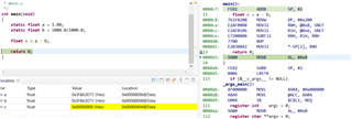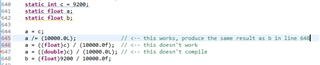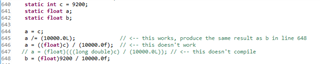 static float foo=1.08; // hex value in memory for foo is 3F8A3D71, the actual float value = 1.08000004 foo = 1080.0 / 1000.0; // hex value in memory for foo becomes 3F8A3D70, the actual float value = 1.07999992