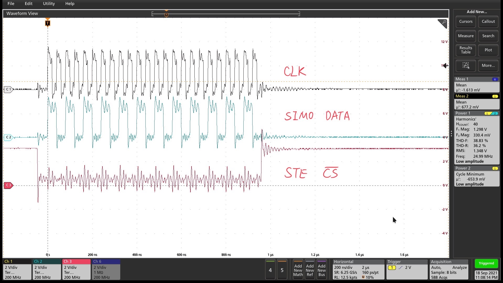 Then, for testing, the following code is executed in the main loop to output three sets of 8 bits SPI data.