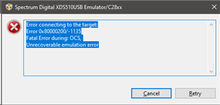C28xx: Error: Error 0x20000024/-1135 Severe Error during: Register, Execution, Unrecoverable emulation error