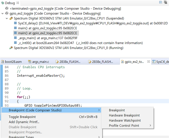 When I try to debugging my target board with your sample project like as 'led_ex1_blinky', I have trouble with using break point in flash mode.