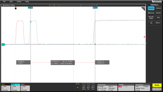 The cursors shows the latency between EPWMSYNCIN impulse and synchronization event. The delay is about 90 ns, which corresponds to 9 EPWMCLK cycles.