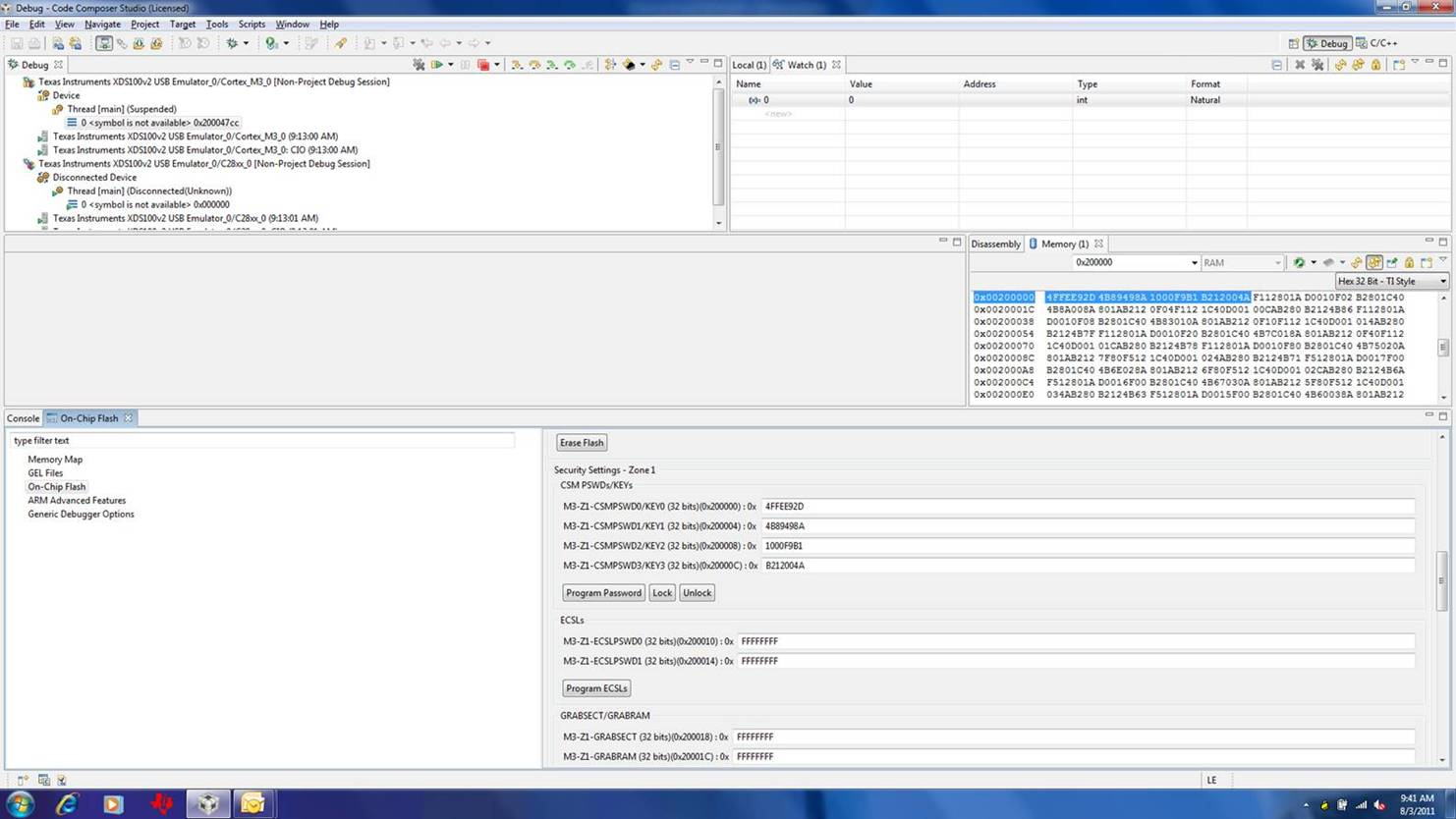 - Open a memory window to location 0x20000 and look at the first 4 32bit words. These are the zone 0 password locations. Copy these values into your favorite text editor.