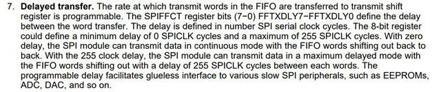 The difference between the two would be primarily in the SPIFFCT[TXDLY] bit, which can configure a delay in the transfer of data when using FIFO mode. Adding a delay would result in a non-continuous transfer of words (meaning you would be adding some delay time in between transferring words of data) whereas having no delay would result in a continuous transfer of words. This is further described in the device TRM in section 9.3.7 SPI FIFO Description as well as the register field description in section 9.5.2.11 SPIFFCT Register. Here is a snippet from 9.3.7: