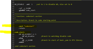 Bootloader code ---------------------- #pragma CODE_SECTION(bankSelect, "codestart"); void bankSelect(void) { if((HWREG((uint32_t)B0_KEY_ADD) != (uint32_t)KEY)) { CPU1_Kernel(); } else { // // Branch to 0x00088000; the codestart of bank 0 is // located at 0x00088000, which is a flash alt. entry point // asm(" LB 0x00088000"); } } bootloader memory configuration .cmd file -------------------------------------------- // Keep the _bankSelect symbol // -u bankSelect MEMORY { /* BEGIN is used for the "boot to Flash" bootloader mode */ BEGIN : origin = 0x080000, length = 0x000100 BOOT_RSVD : origin = 0x000002, length = 0x0001AF /* Part of M0, BOOT rom will use this for stack */ RAMM0 : origin = 0x0001B1, length = 0x00024F RAMM1 : origin = 0x000400, length = 0x0003F8 /* on-chip RAM block M1 */ RAMM1_RSVD : origin = 0x0007F8, length = 0x000008 /* Reserve and do not use for code as per the errata advisory "Memory: Prefetching Beyond Valid Memory" */ RAMD0 : origin = 0x00C000, length = 0x000800 RAMD1 : origin = 0x00C800, length = 0x000800 //RAMD01 : origin = 0x00C000, length = 0x001000 RAMLS0 : origin = 0x008000, length = 0x000800 RAMLS1 : origin = 0x008800, length = 0x000800 RAMLS2 : origin = 0x009000, length = 0x000800 RAMLS3 : origin = 0x009800, length = 0x000800 RAMLS4 : origin = 0x00A000, length = 0x000800 RAMLS5 : origin = 0x00A800, length = 0x000800 RAMLS6 : origin = 0x00B000, length = 0x000800 RAMLS7 : origin = 0x00B800, length = 0x000800 RAMGS0 : origin = 0x00D000, length = 0x001000 RAMGS1 : origin = 0x00E000, length = 0x001000 RAMGS2 : origin = 0x00F000, length = 0x001000 RAMGS3 : origin = 0x010000, length = 0x001000 RAMGS4 : origin = 0x011000, length = 0x001000 RAMGS5 : origin = 0x012000, length = 0x001000 RAMGS6 : origin = 0x013000, length = 0x001000 RAMGS7 : origin = 0x014000, length = 0x001000 RAMGS8 : origin = 0x015000, length = 0x001000 RAMGS9 : origin = 0x016000, length = 0x001000 RAMGS10 : origin = 0x017000, length = 0x001000 RAMGS11 : origin = 0x018000, length = 0x001000 RAMGS12 : origin = 0x019000, length = 0x001000 RAMGS13 : origin = 0x01A000, length = 0x001000 RAMGS14 : origin = 0x01B000, length = 0x001000 RAMGS15 : origin = 0x01C000, length = 0x000FF8 // RAMGS15_RSVD : origin = 0x01CFF8, length = 0x000008 /* Reserve and do not use for code as per the errata advisory "Memory: Prefetching Beyond Valid Memory" */ /* Flash sectors */ IPC_FLASH_MY : origin = 0x080100, length = 0x000100 /* on-chip Flash */ FLASH0 : origin = 0x080200, length = 0x001E00 /* on-chip Flash */ FLASH1 : origin = 0x082000, length = 0x002000 /* on-chip Flash */ FLASH2 : origin = 0x084000, length = 0x002000 /* on-chip Flash */ FLASH3 : origin = 0x086000, length = 0x002000 /* on-chip Flash */ FLASH4 : origin = 0x088000, length = 0x008000 /* on-chip Flash */ FLASH5 : origin = 0x090000, length = 0x008000 /* on-chip Flash */ FLASH6 : origin = 0x098000, length = 0x008000 /* on-chip Flash */ FLASH7 : origin = 0x0A0000, length = 0x008000 /* on-chip Flash */ FLASH8 : origin = 0x0A8000, length = 0x008000 /* on-chip Flash */ FLASH9 : origin = 0x0B0000, length = 0x008000 /* on-chip Flash */ FLASH10 : origin = 0x0B8000, length = 0x002000 /* on-chip Flash */ FLASH11 : origin = 0x0BA000, length = 0x002000 /* on-chip Flash */ FLASH12 : origin = 0x0BC000, length = 0x002000 /* on-chip Flash */ FLASH13 : origin = 0x0BE000, length = 0x001FF0 /* on-chip Flash */ // FLASH13_RSVD : origin = 0x0BFFF0, length = 0x000010 /* Reserve and do not use for code as per the errata advisory "Memory: Prefetching Beyond Valid Memory" */ CPU1TOCPU2RAM : origin = 0x03A000, length = 0x000800 CPU2TOCPU1RAM : origin = 0x03B000, length = 0x000800 CPUTOCMRAM : origin = 0x039000, length = 0x000800 CMTOCPURAM : origin = 0x038000, length = 0x000800 CANA_MSG_RAM : origin = 0x049000, length = 0x000800 CANB_MSG_RAM : origin = 0x04B000, length = 0x000800 RESET : origin = 0x3FFFC0, length = 0x000002 } SECTIONS { codestart : > BEGIN, ALIGN(8) .text : >> FLASH0 | FLASH1, ALIGN(8) .cinit : > FLASH1, ALIGN(8) .switch : > FLASH5, ALIGN(8) .reset : > RESET, TYPE = DSECT /* not used, */ .stack : > RAMD0 #if defined(__TI_EABI__) .init_array : > FLASH1, ALIGN(8) .bss : > RAMLS5 .bss:output : > RAMLS5 .bss:cio : > RAMLS5 .data : > RAMLS5 .sysmem : > RAMLS5 /* Initalized sections go in Flash */ .const : > FLASH1, ALIGN(8) #else .pinit : > FLASH1, ALIGN(8) .ebss : > RAMLS5 .esysmem : > RAMLS5 .cio : > RAMLS5 /* Initalized sections go in Flash */ .econst : >> FLASH1 , ALIGN(8) #endif ramgs0 : > RAMGS0, type=NOINIT ramgs1 : > RAMGS1, type=NOINIT MSGRAM_CPU1_TO_CPU2 : > CPU1TOCPU2RAM, type=NOINIT MSGRAM_CPU2_TO_CPU1 : > CPU2TOCPU1RAM, type=NOINIT MSGRAM_CPU_TO_CM : > CPUTOCMRAM, type=NOINIT MSGRAM_CM_TO_CPU : > CMTOCPURAM, type=NOINIT /* The following section definition are for SDFM examples */ Filter_RegsFile : > RAMGS0 Filter1_RegsFile : > RAMGS1, fill=0x1111 Filter2_RegsFile : > RAMGS2, fill=0x2222 Filter3_RegsFile : > RAMGS3, fill=0x3333 Filter4_RegsFile : > RAMGS4, fill=0x4444 Difference_RegsFile : >RAMGS5, fill=0x3333 #if defined(__TI_EABI__) .TI.ramfunc : {} LOAD = FLASH0, RUN = RAMLS0|RAMLS1|RAMLS2|RAMLS3, LOAD_START(RamfuncsLoadStart), LOAD_SIZE(RamfuncsLoadSize), LOAD_END(RamfuncsLoadEnd), RUN_START(RamfuncsRunStart), RUN_SIZE(RamfuncsRunSize), RUN_END(RamfuncsRunEnd), ALIGN(8) #else .TI.ramfunc : {} LOAD = FLASH0, RUN = RAMLS0|RAMLS1|RAMLS2|RAMLS3, LOAD_START(_RamfuncsLoadStart), LOAD_SIZE(_RamfuncsLoadSize), LOAD_END(_RamfuncsLoadEnd), RUN_START(_RamfuncsRunStart), RUN_SIZE(_RamfuncsRunSize), RUN_END(_RamfuncsRunEnd), ALIGN(8) #endif IPC_BANK0 : > IPC_FLASH_MY, PAGE = 0, ALIGN(8) } /* //=========================================================================== // End of file. //=========================================================================== */ Application memory configuration .cmd file -------------------------------------------- MEMORY { /* BEGIN is used for the "boot to Flash" bootloader mode */ BEGIN : origin = 0x088000, length = 0x000002 BOOT_
