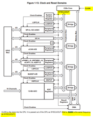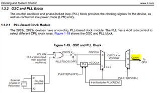 SYSCLKOUT has same frequency as CLKIN derived from diagram below based on PLL settings of the particular device based on user settings.
