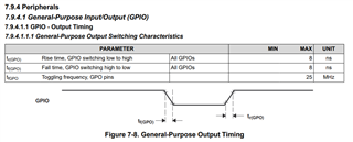For external pins it depends what configurations you have in the peripheral for the output signal, it will output accordingly. For example ePWM you can set the frequency for output signal in ePWM configuration registers and GPIO works accordingly