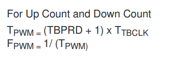 This means that in case of up counting mode or down counting mode, the expected TBPRD value is 79. CMPA register = int((TBPRD + 1) * duty cycle) and CMPAHR = (frac(TBPRD + 1)*MEP_ScaleFactor + 0.5)