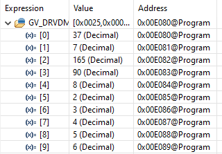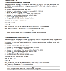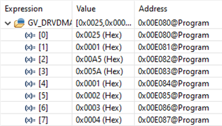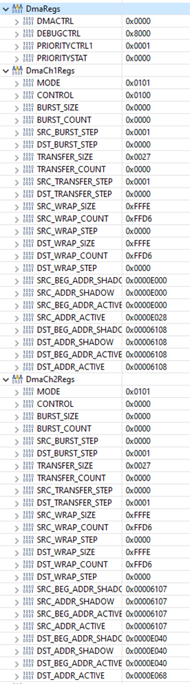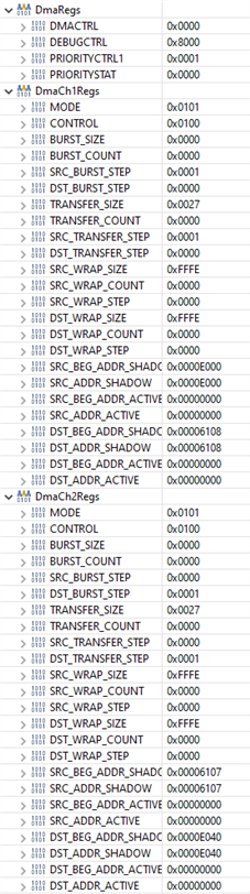 /*********************************/ /* DMA Channel 1, SPI-A transmit */ /*********************************/ GV_sDmaRegs.CH1.MODE.bit.CHINTE = 0; /* 0: Interrupt disabled */ GV_sDmaRegs.CH1.MODE.bit.DATASIZE = 0; /* 0: 16-bit data transfer size */ GV_sDmaRegs.CH1.MODE.bit.ONESHOT = 0; GV_sDmaRegs.CH1.BURST_SIZE.all = 0; /* 1 word/burst */ GV_sDmaRegs.CH1.SRC_BURST_STEP = 1; /* Move to next word in buffer */ GV_sDmaRegs.CH1.DST_BURST_STEP = 0; /* Don't move destination address */ GV_sDmaRegs.CH1.TRANSFER_SIZE = C_DRVDMA_SIZE - 1U; /* C_DRVDMA_SIZE transfer size in bursts */ GV_sDmaRegs.CH1.SRC_TRANSFER_STEP = 1; /* Move to next word in buffer after each word in a burst */ GV_sDmaRegs.CH1.DST_TRANSFER_STEP = 0; /* Don't move destination address */ GV_sDmaRegs.CH1.SRC_WRAP_SIZE = 0xFFFE; /* Put to maximum - don't want source wrap. */ GV_sDmaRegs.CH1.DST_WRAP_SIZE = 0xFFFE; /* Put to maximum - don't want destination wrap. */ GV_sDmaRegs.CH1.SRC_BEG_ADDR_SHADOW = (Uint32) GV_DRVDMA_transferTxDataCh1; /* Start address = DMA buffer */ GV_sDmaRegs.CH1.SRC_ADDR_SHADOW = (Uint32) GV_DRVDMA_transferTxDataCh1; /* Start address = DMA buffer */ GV_sDmaRegs.CH1.DST_BEG_ADDR_SHADOW = C_DRVSPI_SPIA_ADDR + C_DRVSPI_SPITXBUF_OFFSET; /* Start address */ GV_sDmaRegs.CH1.DST_ADDR_SHADOW = C_DRVSPI_SPIA_ADDR + C_DRVSPI_SPITXBUF_OFFSET; /* Start address */ GV_sDmaClaSrcSelRegs.DMACHSRCSEL1.bit.CH1 = 109; /* 109: SPIA_TXDMA as DMA channel 1 Trigger source */ GV_sDmaRegs.CH1.MODE.bit.PERINTSEL = 1; /* Peripheral interrupt select */ GV_sDmaRegs.CH1.MODE.bit.PERINTE = 1; /* Enable peripheral interrupt event */ GV_sDmaRegs.CH1.CONTROL.bit.PERINTCLR = 1; /* Clear peripheral interrupt event flag. */ /********************************/ /* DMA Channel 2, SPI-A receive */ /********************************/ GV_sDmaRegs.CH2.MODE.bit.CHINTE = 0; /* 0: Interrupt disabled */ GV_sDmaRegs.CH2.MODE.bit.DATASIZE = 0; /* 0: 16-bit data transfer size */ GV_sDmaRegs.CH2.MODE.bit.ONESHOT = 0; GV_sDmaRegs.CH2.MODE.bit.CONTINUOUS = 0; GV_sDmaRegs.CH2.BURST_SIZE.all = 0; /* 1 word/burst */ GV_sDmaRegs.CH2.SRC_BURST_STEP = 0; /* Don't move in FIFO */ GV_sDmaRegs.CH2.DST_BURST_STEP = 1; /* Move to next word in destination address */ GV_sDmaRegs.CH2.TRANSFER_SIZE = C_DRVDMA_SIZE - 1U; /* C_DRVDMA_SIZE transfer size in bursts */ GV_sDmaRegs.CH2.SRC_TRANSFER_STEP = 0; /* Don't move source address */ GV_sDmaRegs.CH2.DST_TRANSFER_STEP = 1; /* Move to next word in buffer after each word in a burst */ GV_sDmaRegs.CH2.SRC_WRAP_SIZE = 0xFFFE; /* Put to maximum - don't want source wrap. */ GV_sDmaRegs.CH2.DST_WRAP_SIZE = 0xFFFE; /* Put to maximum - don't want destination wrap. */ GV_sDmaRegs.CH2.SRC_BEG_ADDR_SHADOW = C_DRVSPI_SPIA_ADDR + C_DRVSPI_SPIRXBUF_OFFSET; /* Start address */ GV_sDmaRegs.CH2.SRC_ADDR_SHADOW = C_DRVSPI_SPIA_ADDR + C_DRVSPI_SPIRXBUF_OFFSET; /* Start address */ GV_sDmaRegs.CH2.DST_BEG_ADDR_SHADOW = (Uint32) GV_DRVDMA_transferRxDataCh2; /* Start address = DMA buffer */ GV_sDmaRegs.CH2.DST_ADDR_SHADOW = (Uint32) GV_DRVDMA_transferRxDataCh2; /* Start address = DMA buffer */ GV_sDmaClaSrcSelRegs.DMACHSRCSEL1.bit.CH2 = 110; /* 109: SPIA_RXDMA as DMA channel 1 Trigger source */ GV_sDmaRegs.CH2.MODE.bit.PERINTSEL = 1; /* Peripheral interrupt select */ GV_sDmaRegs.CH2.MODE.bit.PERINTE = 1; /* Enable peripheral interrupt event */ GV_sDmaRegs.CH2.CONTROL.bit.PERINTCLR = 1; /* Clear peripheral interrupt event flag. */
