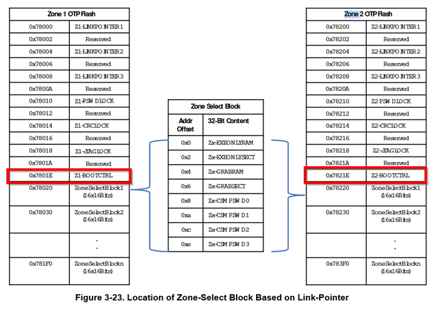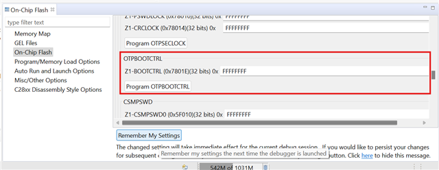 Please write your configurations to the BOOTCTRL registers in the OTP Flash (0x7801E/0x7821E). Here are the register locations in memory per the TRM: