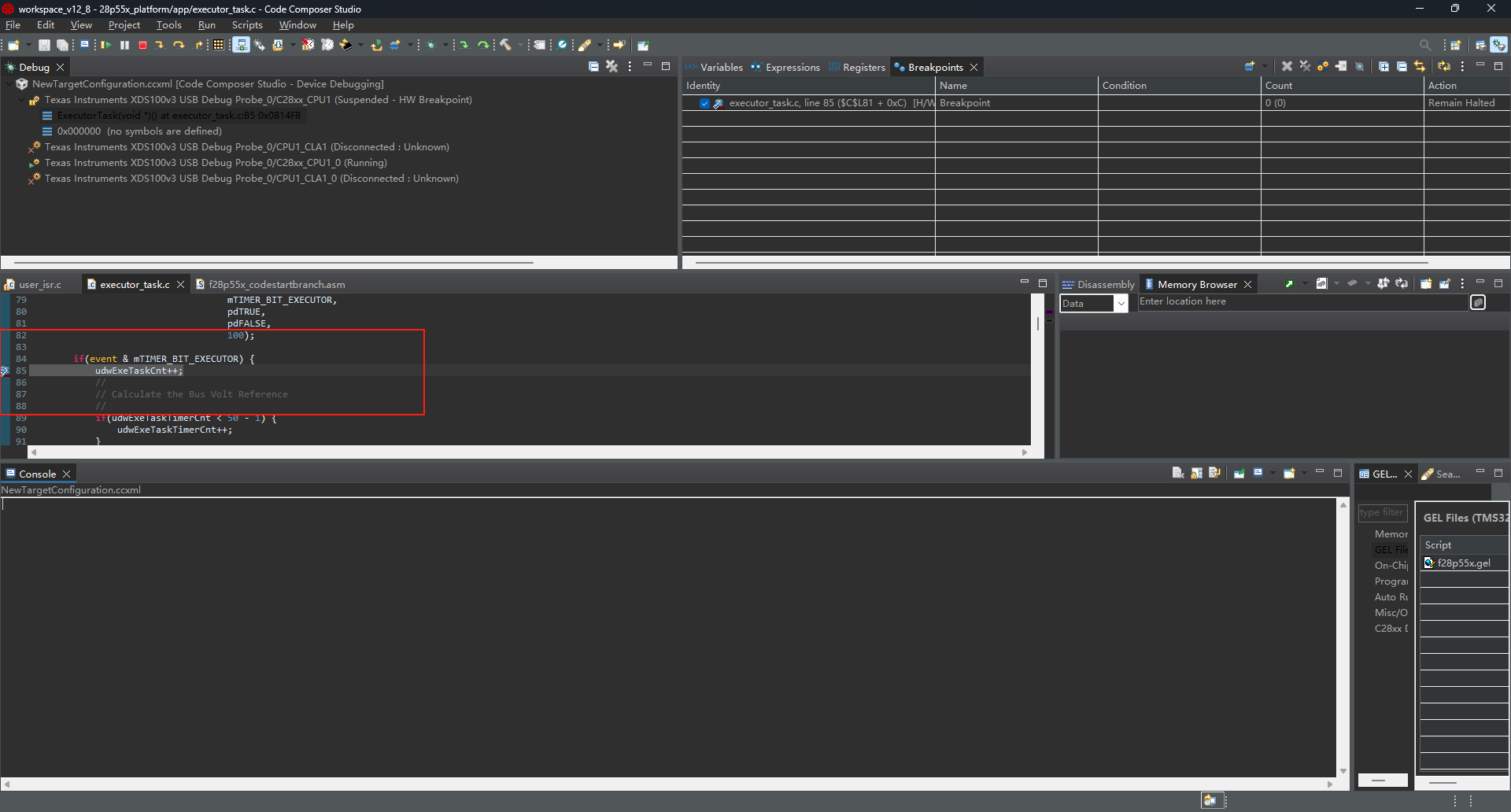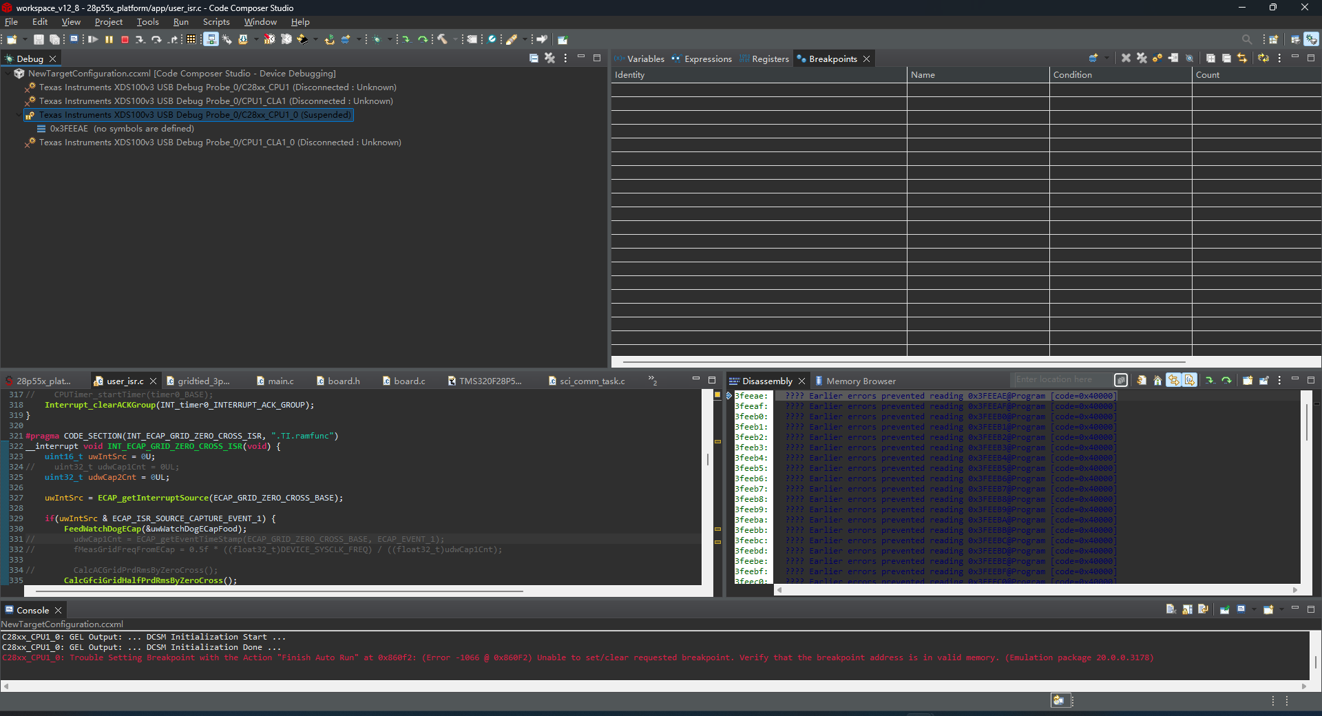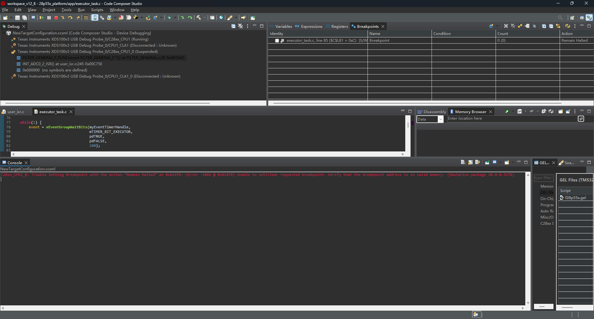 I have a question about debugging two 28p55, they are connected with only one xds100v3 debug probe in dasiy-chain topology. Now I can download the firmware to the respective flash memory of each DSP. However, I'm having trouble setting breakpoints in the code for the slave DSP. The console is showing an error, and I can't set the breakpoints. Please help me solve this problem. Following is a screenshot of my ccxml file.