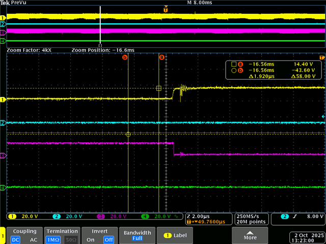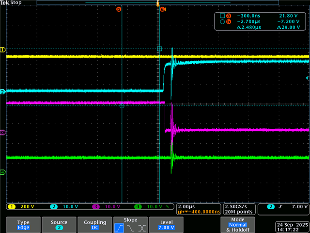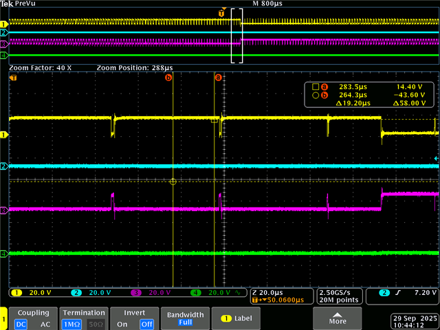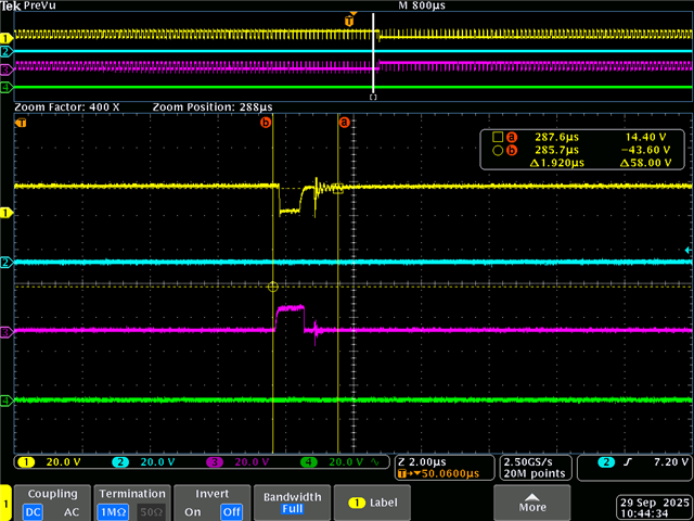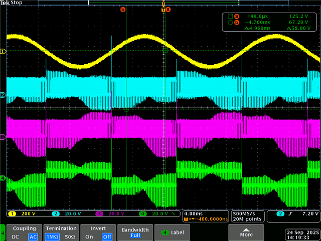 I am running some of tests on TIDM-HV-1PH-DCAC eval system. I ran this system as voltage source inverter in Open Loop mode. The system works as expected. However, I noticed that there are spikes on all 4 gate control signals (i.e. Q1.PWM, Q2.PWM, Q3.PWM, and Q4.PWM). I have a big concern on these spikes that may create the "shoot through" condition and damage the switching devices (MOSFET or IGBT). Can anyone explain why these spikes are present and how to suppress them if possible. The attached picture show the spikes probed on TP15 (ch2), TP16 (ch3), and TP20 (ch4) on the eval board. Thanks for any reply.