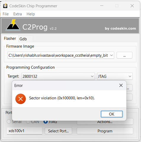 I am using C2Prog to flash my Project hex file . but i am getting Sector Violation issue . check the snippet