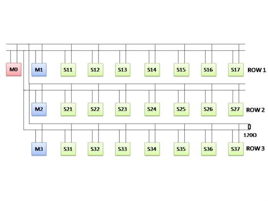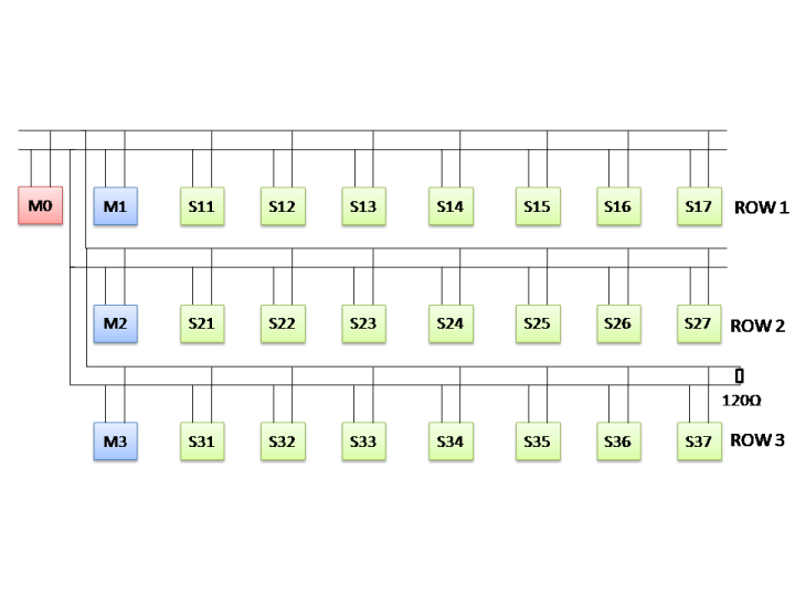 For the initial testing I started connecting with only one row at a time. When I connected only the first row, everything worked fine. M0 communicated with M1 and M1 communicated with S11 to S17. The same I repeated for the second and the third row.