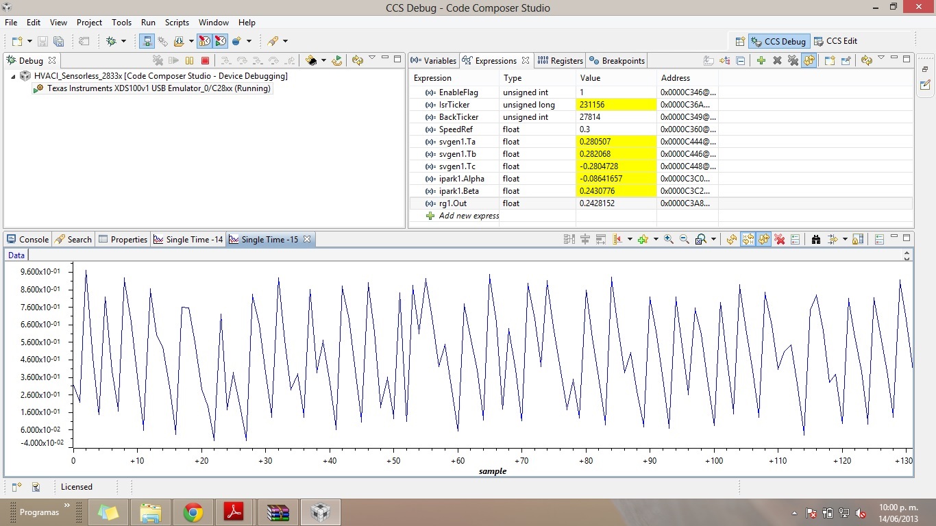 I am running the example HVACI_Sensorless_F2833x (attachment), in the F28335PFG Control card. but I see some errors. when I run the example and graph rg1.Out variable is not observed characteristic ramp.