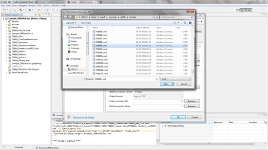 2 To choose command linker file for FLASH configuration (not RAM configuration) through Properties>General>Command Linker File. For example, 28069.CMD.
