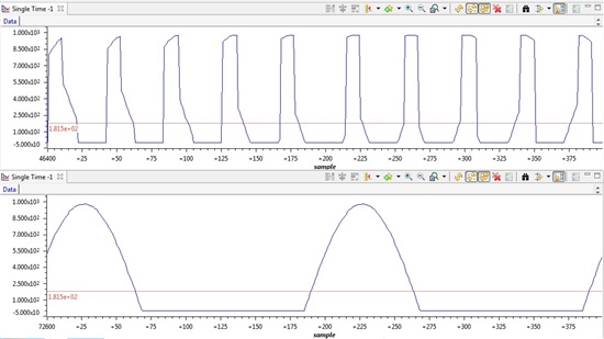 I am trying to graph positive cycle of the simple sinusoidal signal with 60Hz. Whenever the Enableflag is turned to one (whenever the all calculation code is running) graph tool outputting the top figure whenever the EnableFlag is turned to 0 (pretty much nothing goes on) graph tool is outputting bottom figure (possible the last array from the previous cycles).