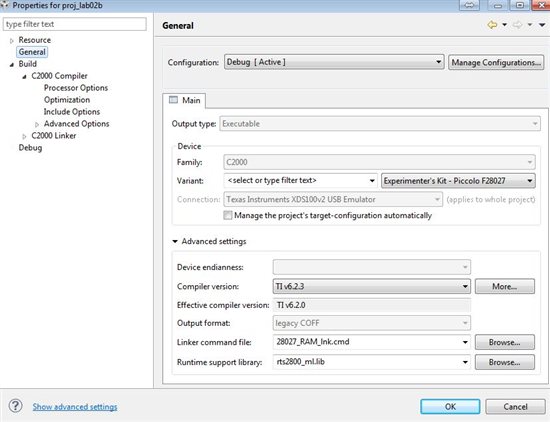 It seems that all my labs in Motorware don't include debug build configurations so I'm having to create them myself. Also, the kit is not listed in the target configurations so I'm using Experimenters Kit - Piccolo F28027. I'm not sure if this is the problem or not.