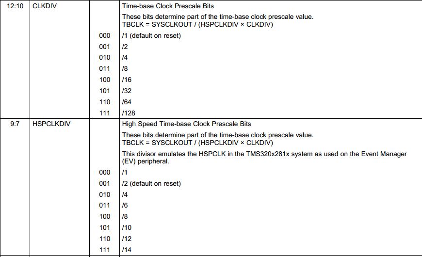 provieded CLKDIV AND HSPCLKDIV=4,tbclk=1/(150e6*4*4) and TPWM=2*TBPRD*TBCLK