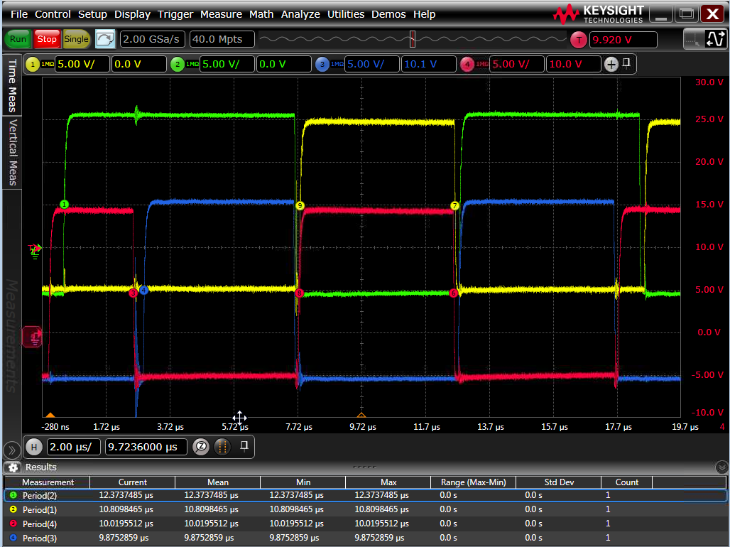 I have been working on getting a closed loop phase shift converter up and running and I am 95% of the way to having things working. Unfortunately I'm seeing some glitches that are causing big problems. Essentially what I'm trying to do is have a slow start algorithm run while I monitor the output voltage of my converter. That process works, however when I switch over from the soft start routine to the normal phase shift operation I get glitches on the "slave" phase shifted ePWM modules. The problem I am seeing is that the period on those particular channels is too long for several switching cycles. I am not using the stock PSFB code; I actually ended up putting in a phase offset in the ePWM1A/B channels and inverting the ePWM2A/B channels to get the proper phase shift I was looking for. I'm not sure if this might be a source of the issue I am seeing. As can be seen below the ePWM1A/B signals (red and blue) have the proper period as soon as the ePWM modules turn on. The ePWM2A/B signals (yellow and green) however have much longer periods than programmed. To avoid glitches I even turned the ePWM modules into input GPIO pins temporarily and only turn them back to ePWM modules as the last step of setup. Provided below are the start up routine and the code for the PSFB setup, as well as a scope capture. I'm running out of ideas and don't have a solid idea of what the source of the problem might be. Any help would be appreciated. - Lance