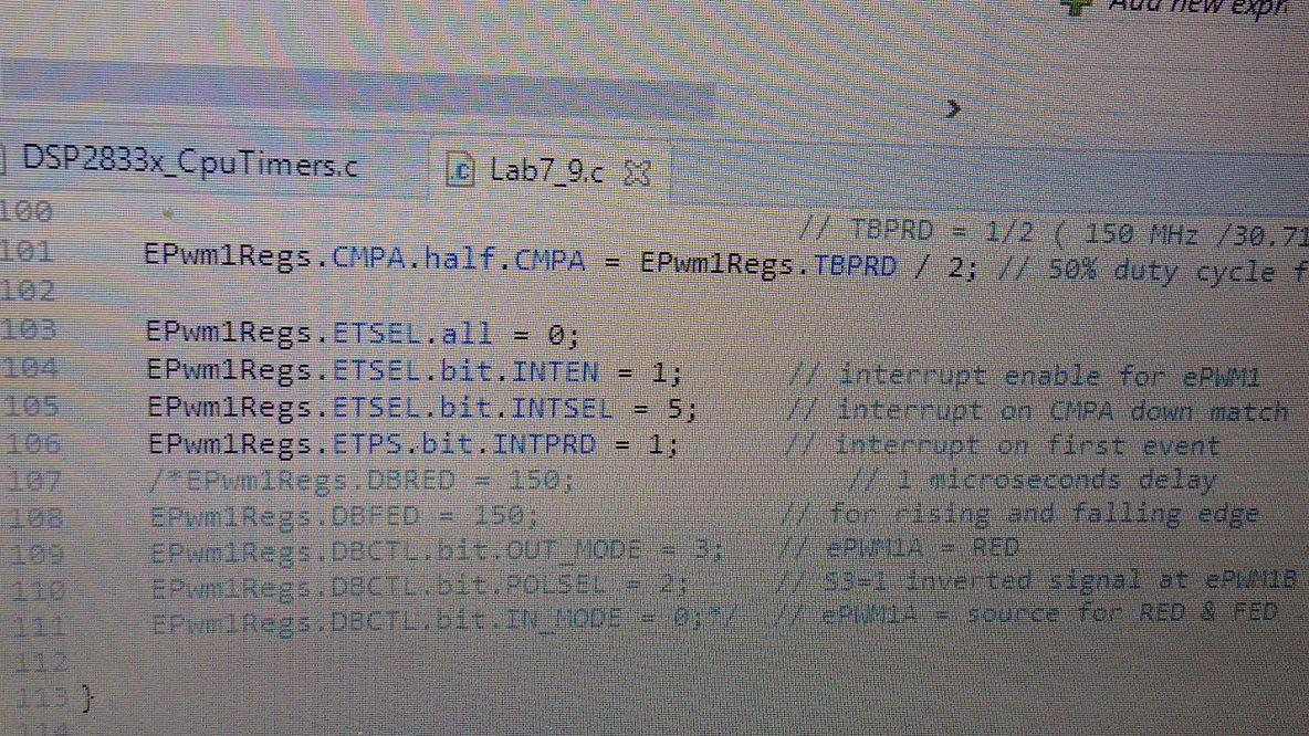 I am using F28335 to generate SPWM code for 60 Hz single phase H-bridge inverter where switching frequency should be 30 KHz. For that I need to generate SPWM with dead band for combating current “shoot-through” problems. Everything is fine with single SPWM signal without using dead band. But when I used dead band module ( 1us dead band, AHC- Active High Complementary), I got clipped signal in the lower half for both EPWM1A and EPWM1B output. I provided the oscilloscope snapshot for both the cases and these signals were collected after a low pass filter. I am also confused whether there is any dead band between the two signals? Again, I am getting switching frequency 26.55KHz after applying dead band. But previously (without deadband), it was around 30 KHz. Moreover, I got an error every time while debugging but I could run the code. The error says: Symbol 'IER' could not be resolved.