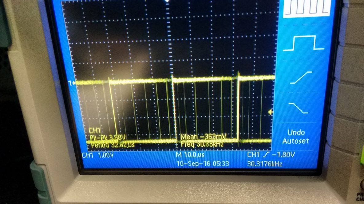 Fig 2: SPWM output without filtering (when dead band is used, frequency showing 26.542 Khz instead of 30 Khz)