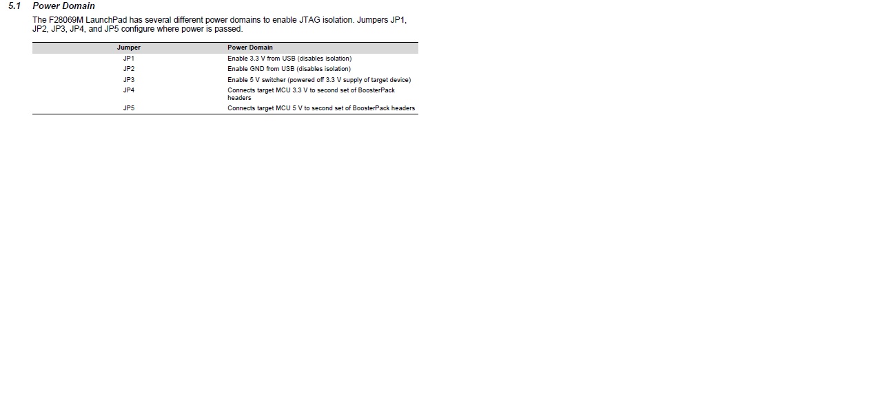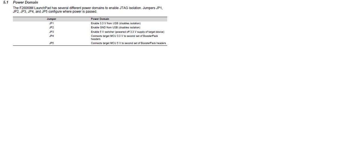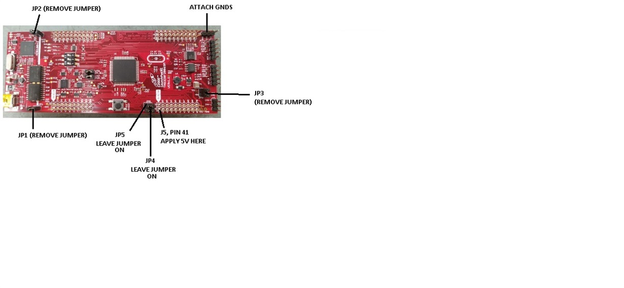 We will be using 5v to power the launchpad. Referencing the User Guide, we figure we must remove the jumpers on JP1 and JP2, and then apply the 5v to J5 Pin 41, as shown below.