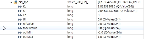 // set the default speed PID controller parameters // Kp = _IQ(0.02*pUserParams->maxCurrent*pUserParams->iqFullScaleFreq_Hz/pUserParams->iqFullScaleCurrent_A); // Ki = _IQ(2.0*pUserParams->maxCurrent*pUserParams->iqFullScaleFreq_Hz*pUserParams->ctrlPeriod_sec/pUserParams->iqFullScaleCurrent_A); Kp = _IQ(0.035*pUserParams->maxCurrent*pUserParams->iqFullScaleFreq_Hz/pUserParams->iqFullScaleCurrent_A); Ki = _IQ(2.5*pUserParams->maxCurrent*pUserParams->iqFullScaleFreq_Hz*pUserParams->ctrlPeriod_sec/pUserParams->iqFullScaleCurrent_A); Kd = _IQ(0.0); outMin = _IQ(-1.0); outMax = _IQ(1.0); PID_setGains(obj->pidHandle_spd,Kp,Ki,Kd); PID_setUi(obj->pidHandle_spd,_IQ(0.0)); PID_setMinMax(obj->pidHandle_spd,outMin,outMax); CTRL_setGains(handle,CTRL_Type_PID_spd,Kp,Ki,Kd);