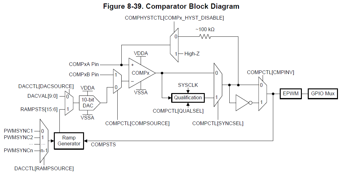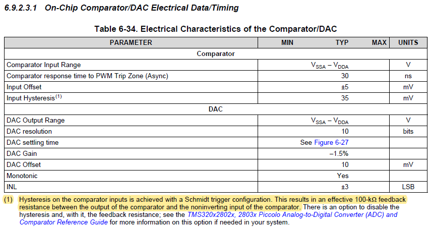 I don't find this point on Electrical Characteristics of the Comparator/DAC(SPRS584L.pdf).