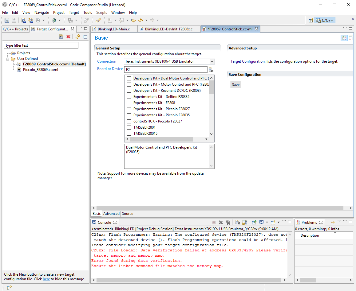When attempting to run the F28069 Blinking LED example code, I find that no target matches my F28069 controlStick in CCS Ver 4.2.1.00004. I tried selecting the F28027 Target hoping that it would work but no luck.
