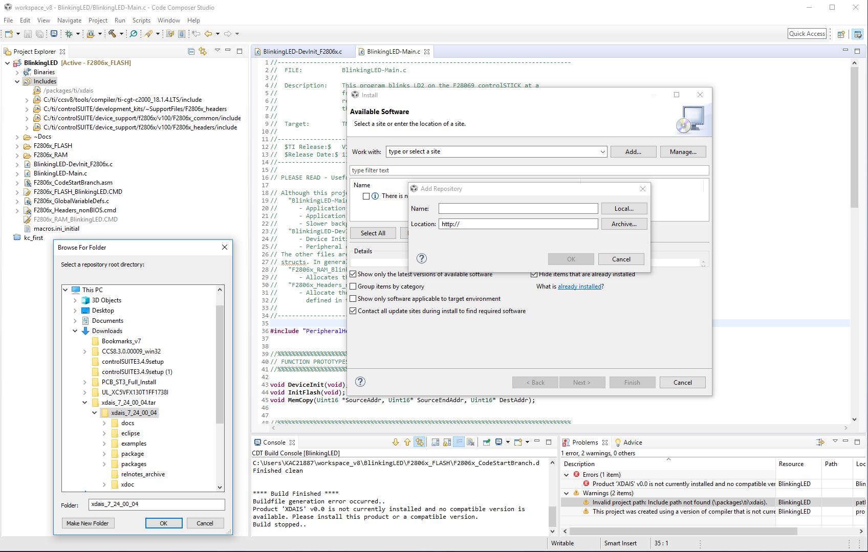 Last week I had CCS v7/8, controlSuite 3.4.9 and some C2000 ware installed and when attempting to run the blinking LED demo the system informed me that the code for the Blinking LED was done on an earlier version of the compiler. The suggestion I saw at the time in E2E was to uninstall everything and get the necessary version of CCS. I done it and my device that should be in the list of available devices is not there.