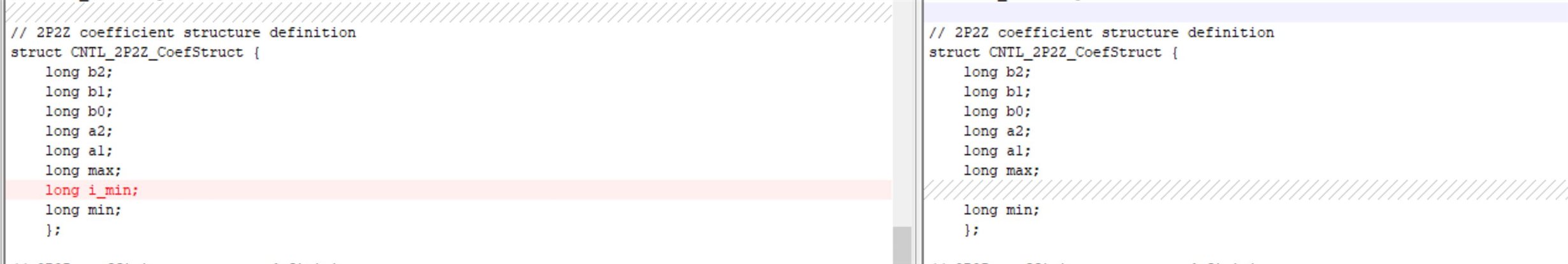 It defines a data structure for the coefficients of the CNTL_2P2Z: 2-pole 2-zero library. The struct definition defines 8 elements, but when compared to the assembler code it appears to only access 7.