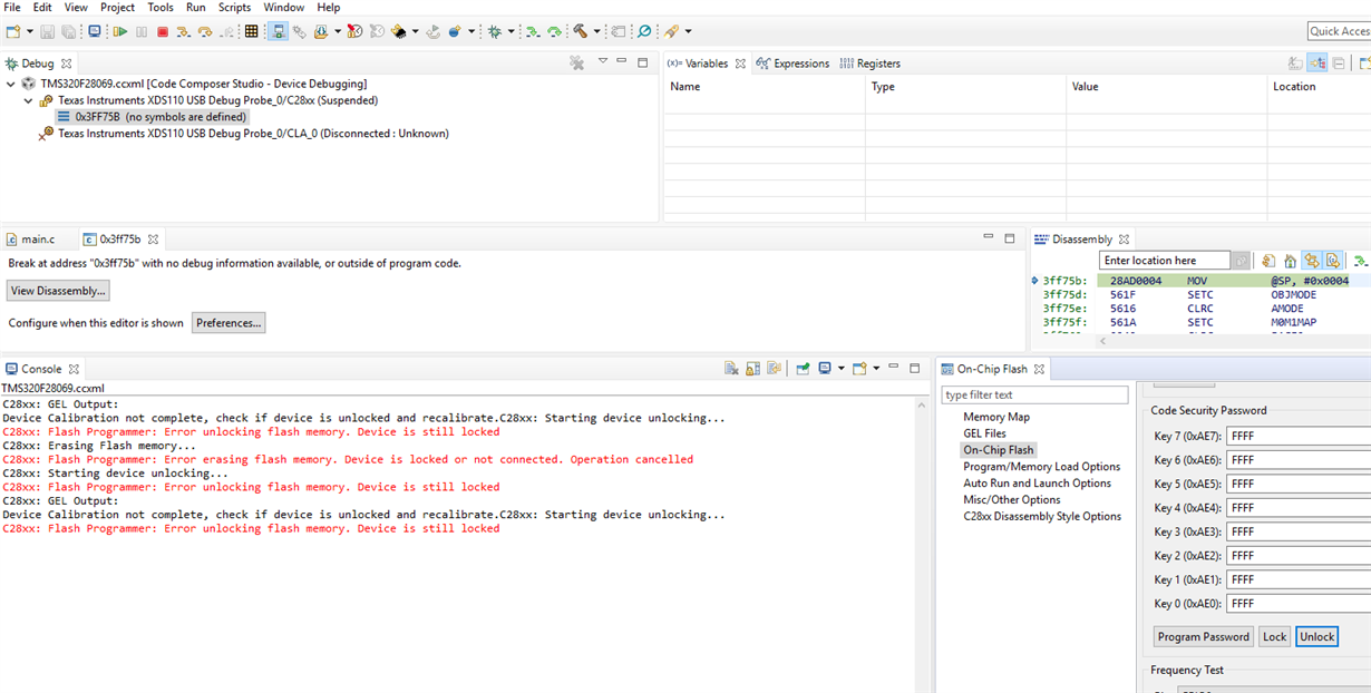 If I try to enter debug session I can connect to MCU and view status but when I try to debug/donwload the code CCS send the error: C18xx: Flash programmer: Error unlocking flash memory. Device is still locked. MCU can not be unlocked and erased. The key pass is all set to 0xFFFF.