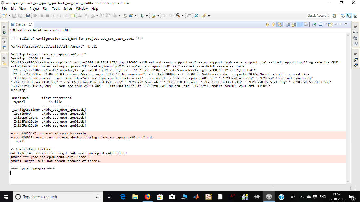 When I am trying to build adc_soc_epwm example, I am getting compilation failure. However other examples are running fine. I have attached my console log and code files.