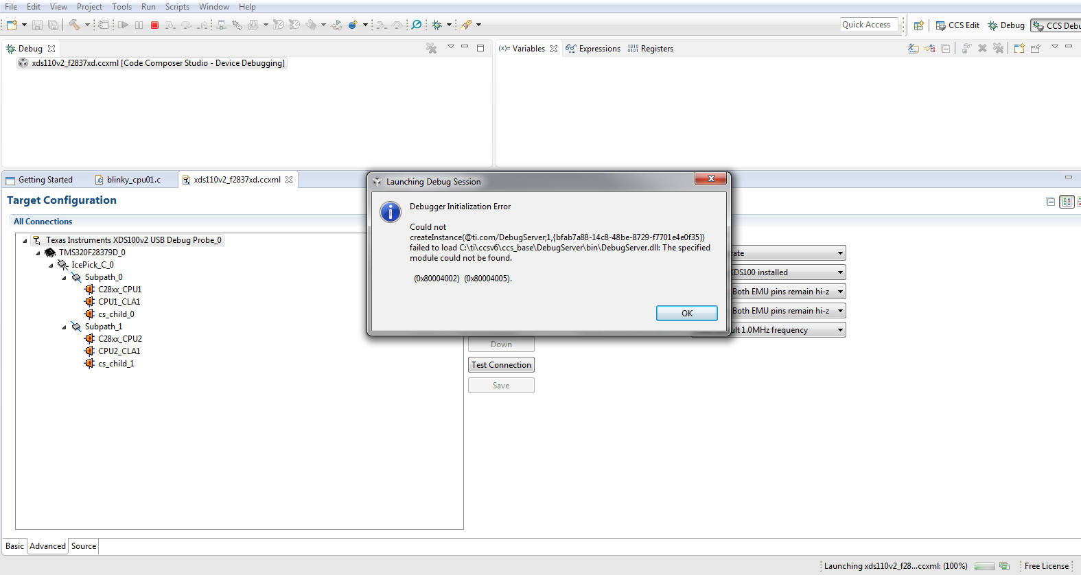 But On Power up LaunchPad performs Demo Application perfectly. when I press Debug Button Getting dialogue box to select CPU1 or CPU2 after selecting no process is being done(No debug Process).