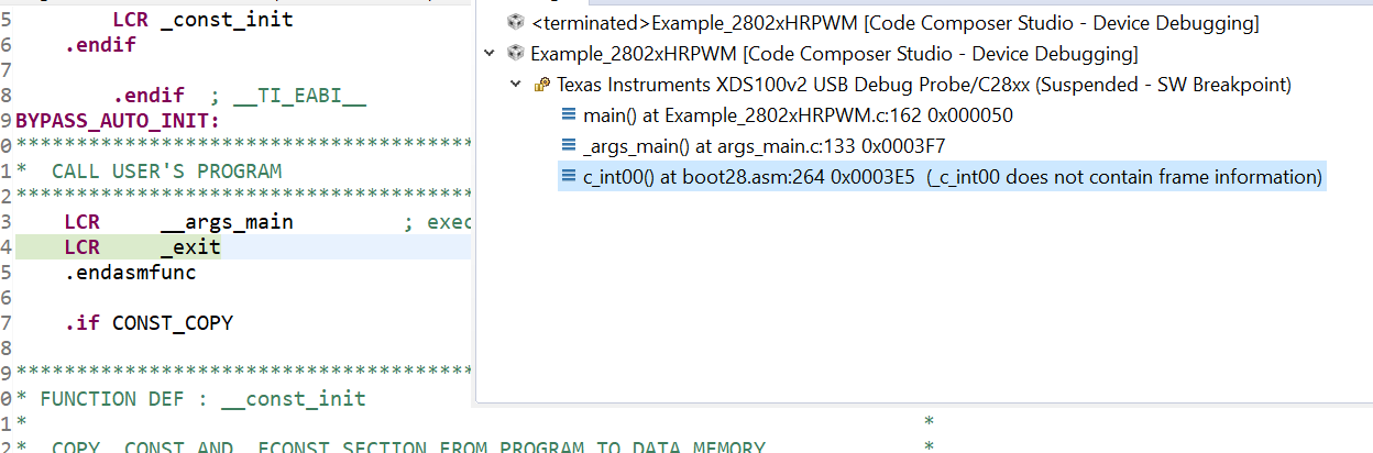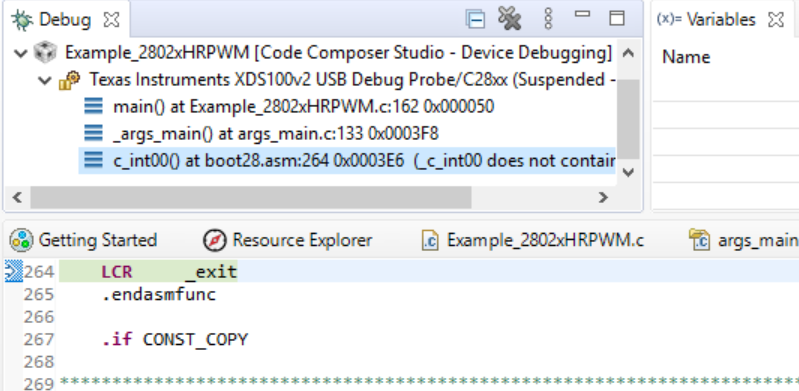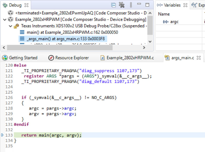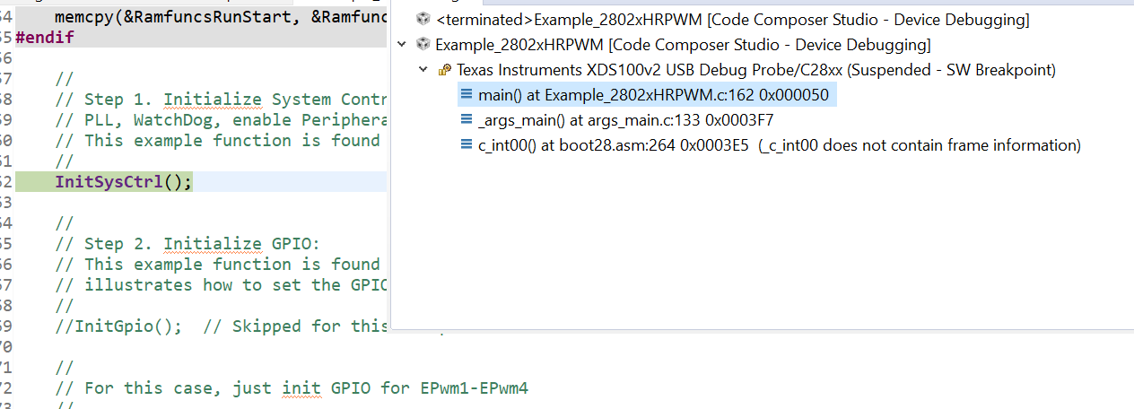 I have asked this question before but haven't got satisfied response. I am just stuck at a point. When ever I am debugging simple hrpwm example from resource explorer then I get error due t which I am not getting any utput. The erroe is given in pictures. Kindly suggest me a solution.