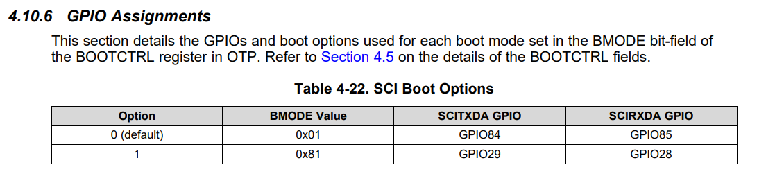 I have a problem trying to program the f28377s through boot sci. I read the technical reference manual and I saw that pins 84 and 85 are the default values. It is possible to change to 28 and 29 writing OTP memory. I wrote it trying to write only the BMODE field (0x81 value). After that I´m still not able to program through boot sci and now, after programming the flash through JTAG the program runs, but then I power off and power on the board and program does not run. I have 3 more boards with the OTP not programed yet and with JTAG I am able to program them (with the same program as in board with the OTP already programmed) and after power off and power on the boards run the program correctly.