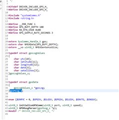 typedef struct gpsLogValues { char utc[10]; char latitude[11]; char longitude[12]; char date[6]; char satellites[3]; }gpsLogValues_s; typedef struct gpsData { gpsLogValues_s *gpsLog; }gpsMssg_s;