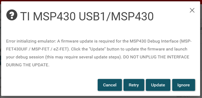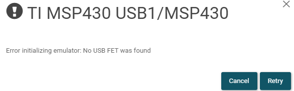 I have tried to use UniFlash to load the USB2ANY firmware, which also failed because it doesn't recognize the USB-FET: