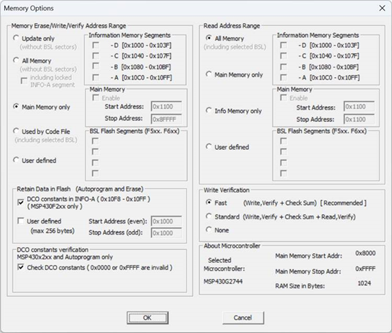 - The "FET-Pro430" "Memory Option" does not have any effect.