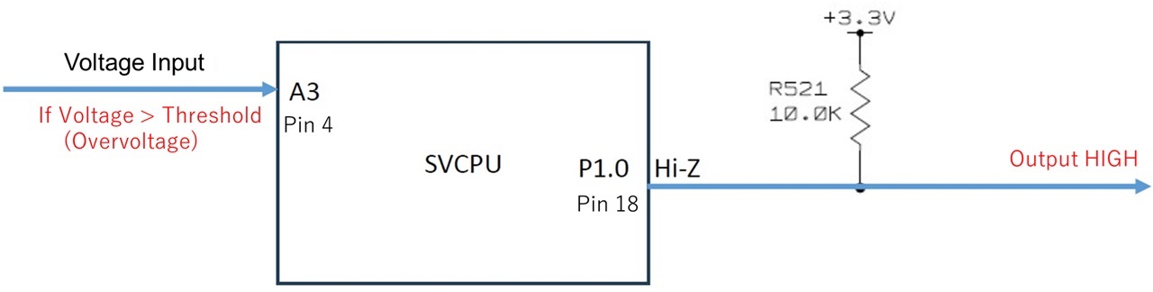 In their system, GPIO (Pin 18) outputs High when the input voltage into ADC (Pin 4) exceeds the certain set value as overvoltage.