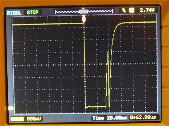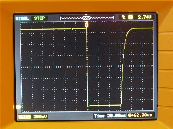Then, somewhere between 250 ticks and 500 ticks, Something Happens: ADC10 unexpectedly reports a value exceeding not just the 757 "trip point" but well above it, in several cases reporting values of 0x3ff (144degC).