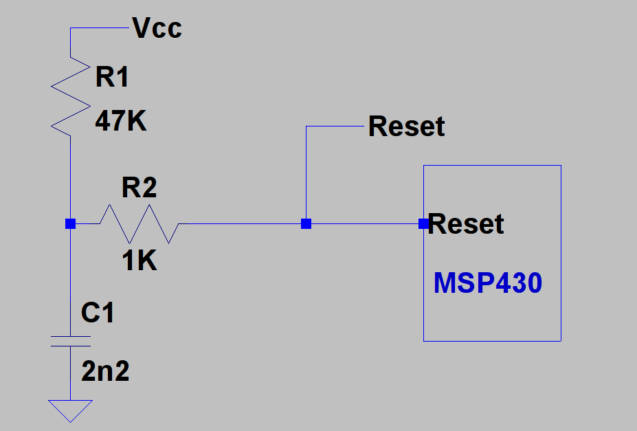 2. Reset pin is connected by R=47K & C=1nF.It is active low for MSP430G2553.