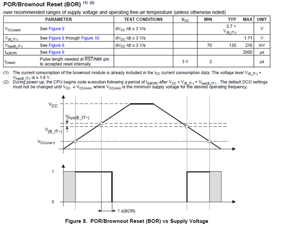 The BOR is a very simple circuit that holds the MSP430 in reset until VCC reaches a threshold voltage. As seen below, in Figure 8, the BOR threshold is max 1.71 V + 210 mV. It has been seen as low as 1.5V. When VCC is rising and reaches this threshold, Reset is released after a small delay, Td(bor), which is max 2ms in this case. There is a time delay to allow VCC to rise to a reasonable voltage before releasing reset. This is what allows the BOR thershold to vary from chip to chip.