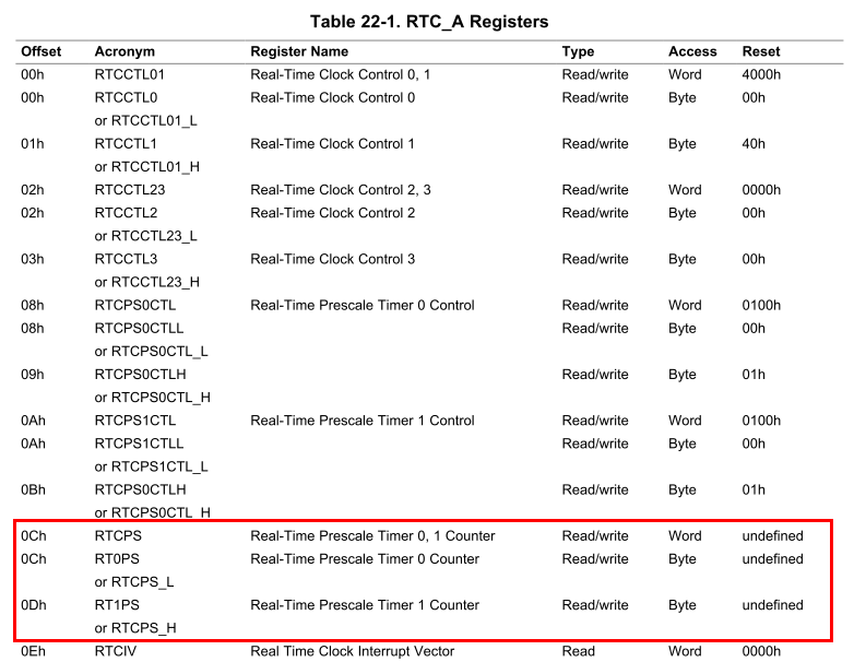 I see RTCPS displayed under Registers (Code Composer 4) -> RTC__Real_Time_Clock -> RTCPS. I don't see a detailed description in the Msp430x5xx & 6xx User Guide Manual ... slau208h. Is this msec in an unsigned int format?