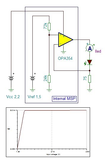 I am building a very simple MSP 430-based controller, and I need a single output to drive the LED in a solid state relay. To make it work over a range of discharging battery voltages (3.3v and lower), I thought a constant current output (10 ma or less) would be appropriate. I'm a software guy, so I have very little analog hardware expertise, but I seem to remember that one can make a constant current driver with an op amp or two. To keep the part count low, I'd like to use the op amp(s) in an MSP 430.
