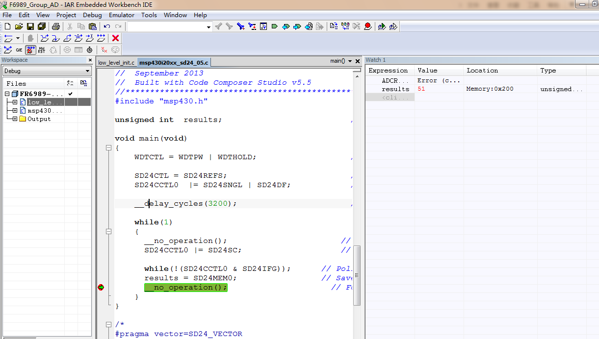 results[index++] = SD24MEM0; // Save CH0 results (clears IFG)