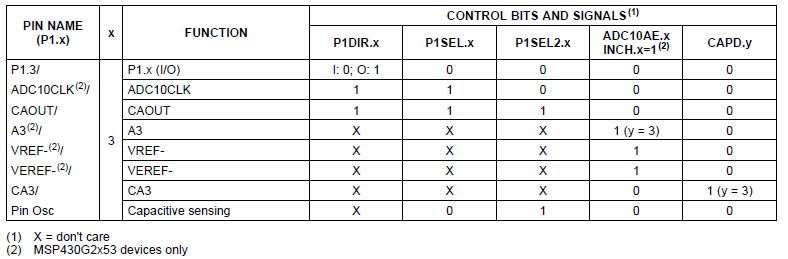 is no valid configuration of P1.3 - when you set P1SEL in combination with P1DIR then you can select the ADC10CLK output function. Or setting P1SEL in combination with P1SEL2 and P1DIR will select the CAOUT function. But only setting P1SEL is nothing: