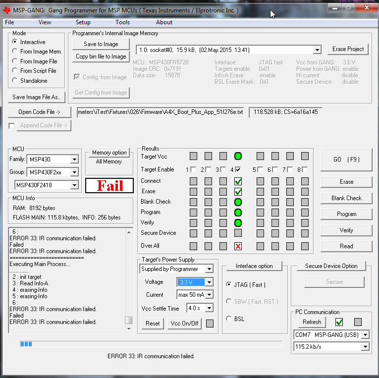 I am trying to get a MSP-GANG Programmer to work with a MSP430F2418. Every time that I try to program the board I am given an Error 33: IR Communication Failed. I have tried wiring this so that the programmer supplies the power (pin 2 connected) and that the board is self powered (pin 4 connected). In trouble shooting I have tried changing the voltage supplied from the programmer from 3.0V to 3.3V, Changed the JTAG writing Speed, and obviously looking into if self powered helps. The length of the cable is approximately 10 cm long so length is not the issue. I monitored the voltage at the VCC pin and it was constantly 3.0 Volts. In addition to this I have varied the Vcc settle speed from 0 - 4.0 seconds in addition to changing the current between 30mA and 50mA.