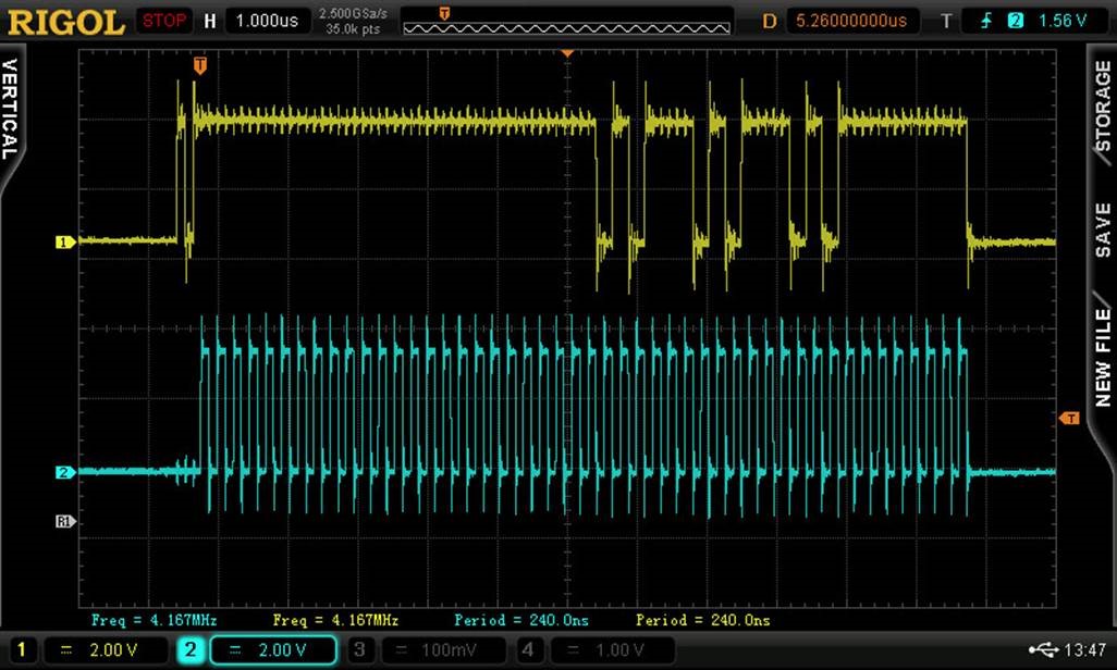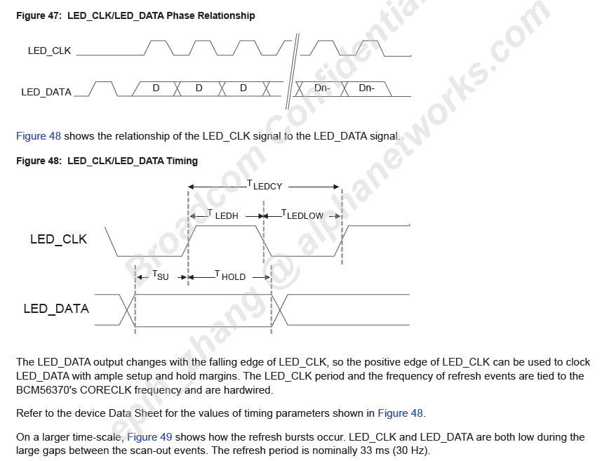 The LED data and status signal from BCM56370 is proprietary and is running at 5 MHz, as shown in Figure 47. In addition, driving 4x TLC5955 also consumes a lot of resources, currently the signal is made by driving GPIOs and timers. Therefore, I need a workable interface to capture and parse the input LED data signal from BCM56370 without consuming too much resource. Please advice! Thank you very much!